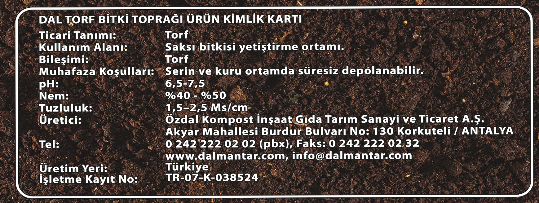 Dal Bitki Toprağı, uzun yıllar çalışmalarımız sonucu elde ettiğimiz tecrübelere dayanarak bileşenlerini, karışımlarını tamamen bitki kökelenmesi ve gelişimine uygun şekilde harmanlanmıştır. Her türlü bitki tohumlamasında kullanılabildiği gibi çiçekli çiçeksiz saksı bitkilerinde, bahçenizde veya saksıda yetiştirmek istediğiniz sebze fidelerinde, sera ortamında yetiştirilen her türlü bitkilerde hızlı köklenmesi sayesinde çelikten, tohumdan, soğandan bitkilerde köklerin yayılımında yardımcı etken olan yumuşaklık ve hava boşluklarının sağlanması en önemli özelliklerindendir. Dal bitki toprağı yüksek nem oranına sahip kokusuz steril olmasının yanında %100 organik bir üründür.